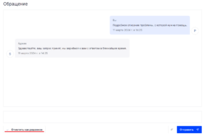 После создания обращения откроется чат со специалистом технической поддержки, где вы сможете получить ответ на ваш запрос или уточнить другие детали обращения.